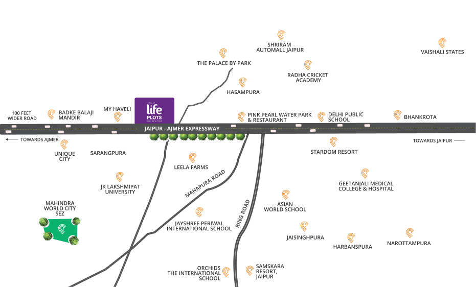 Situated in the future heart of Jaipur’s real estate growth, close proximity to ring road which connects cities like Delhi, Jaipur, Kota, Agra, Jodhpur, and Ajmer